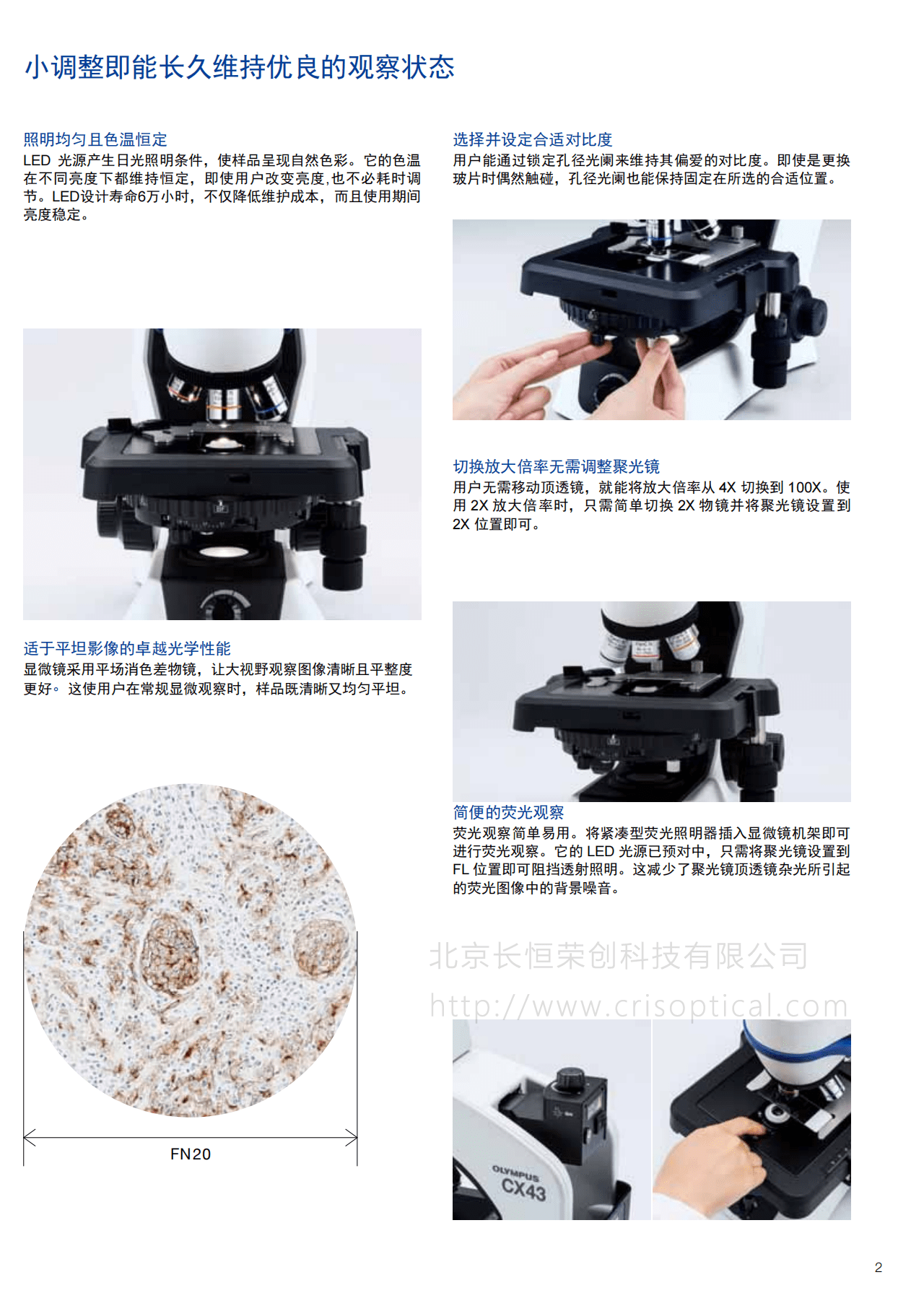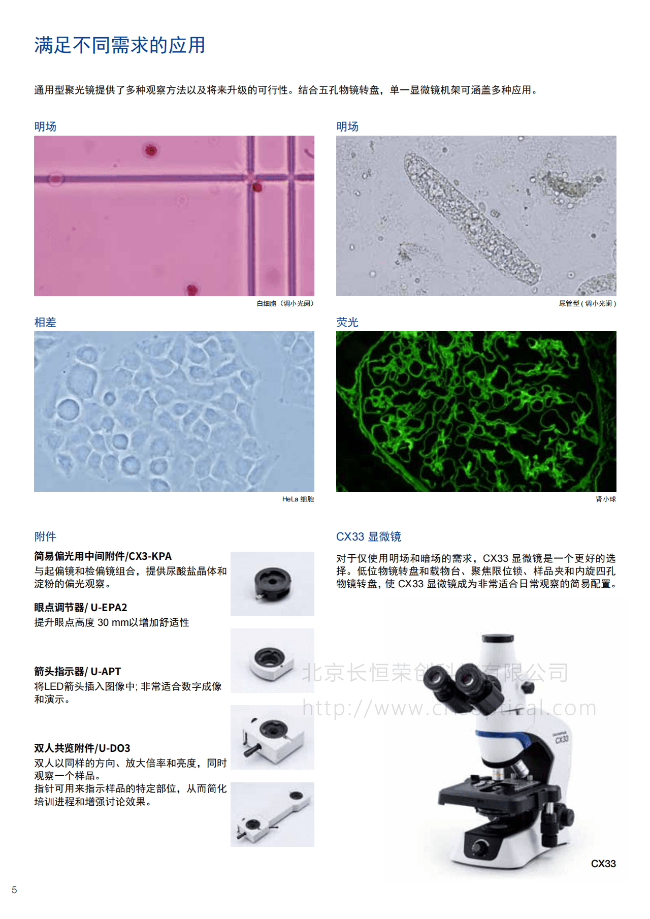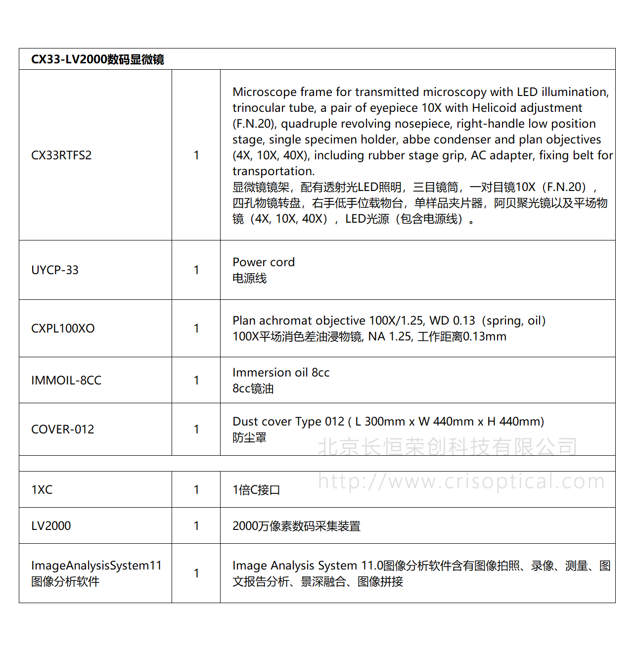 多功能鏡頭選擇: CX33提供多種倍率的鏡頭選擇,涵蓋了從低倍到高倍的范圍,適應不同樣本的觀察需求。